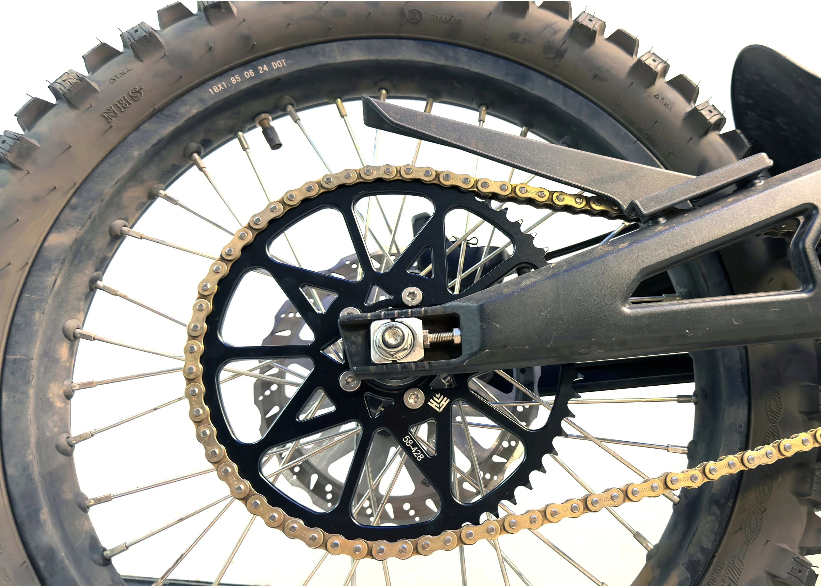 Want to get that grunt out of the corner on your E-Moto, or put massive power down with all of your upgrades? This sprocket was created out of necessity. As we kept bending all other aftermarket aluminum sprockets, not from hitting things! From the sheer torque these bikes produce when landing jumps. Which forced us to move back to the OEM style steel sprockets, so we wouldn't keep throwing chains and messing up motors.